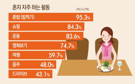 그렇다면 혼자 하는 활동에는 주로 무엇이 있을까? 혼밥, 혼술, 혼놀, 혼영, 혼행까지~