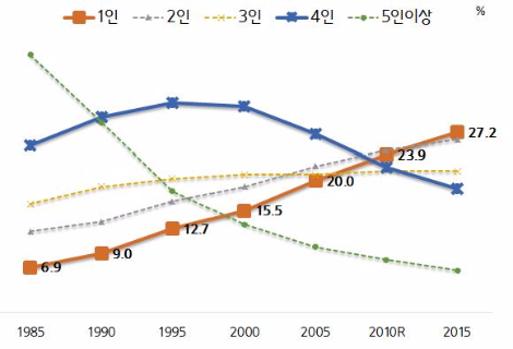 참고로 2015년 기준 주요 국가의 1인 가구 비율은 노르웨이가 37.9%로 가장 높고 일본(32.7%), 영국(28.5%), 미국(28.0%) 순이다.