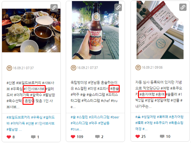 예전에는 혼자 뭔가를 하는 것이 눈치 보이고 쓸쓸한 일이었다면 최근에는 즐기는 모습이랄까. 만족과 기쁨의 감정 그래프가 높은 것을 볼 수 있다. 또한 아래와 같이, 혼자 활동하는 모습을 당당하게 자신의 SNS에 올리기도 한다.