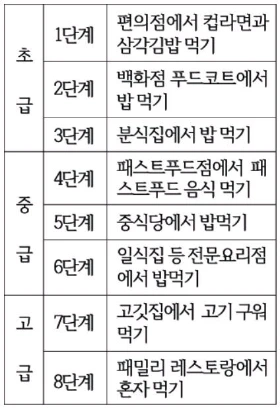 혼자 고기를 구워 먹거나 패밀리 레스토랑에서 밥 먹을 정도는 되어야 혼밥 고수라고 할 수 있다. 나는 혼밥을 해보았는지, 몇 단계 정도 인지 확인해보자. 아직이라면 한번 도전해 보는 것도 좋을 것!