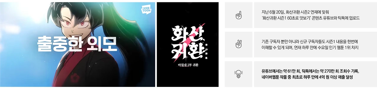 한 작품 당 연재 기간이 긴 웹툰의 특성 상 휴재 또는 시즌 분할은 흔한 일입니다. 때문에, 재연재 시 다시 구독자들을 끌어들이는 것은 중요한 미션입니다. 네이버웹툰은 이 임무를 달성하고자 과거 웹툰의 줄거리를 1분 남짓의 짧은 애니메이션으로 요약, 주요 숏폼 채널인 유튜브와 틱톡에 영상을 업로드했습니다. 이는 단시간에 주요 내용을 임팩트 있게 설명·확산시켜 재연재 작품에 대한 구독자의 진입장벽을 낮췄고, 많은 수의 조회수와 매출을 올릴 수 있었습니다.