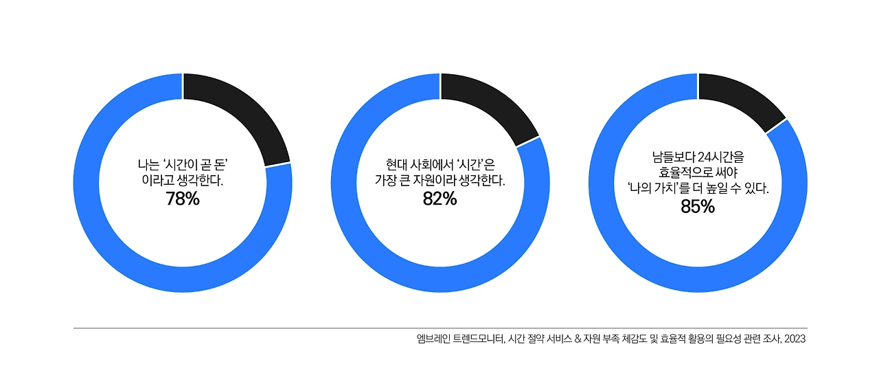 볼거리, 놀거리, 먹을거리가 다양해지며 한정된 시간을 얼마나 가치 있게 사용하는가에 대한 소비자들의 관심이 여느 때보다 높습니다. 관련 설문조사에 따르면 10명 중 8명이 시간은 곧 돈이자 중요한 자원이며, 나의 가치를 높이기 위해 24시간을 효율적으로 사용해야 한다고 응답했습니다. 이에 따라 실패의 경험은 줄이고 시간 절약엔 도움이 되는 제품·서비스, 장편보단 짧은 영상 위주의 숏폼 등을 소비하는 트렌드가 나타나고 있습니다.