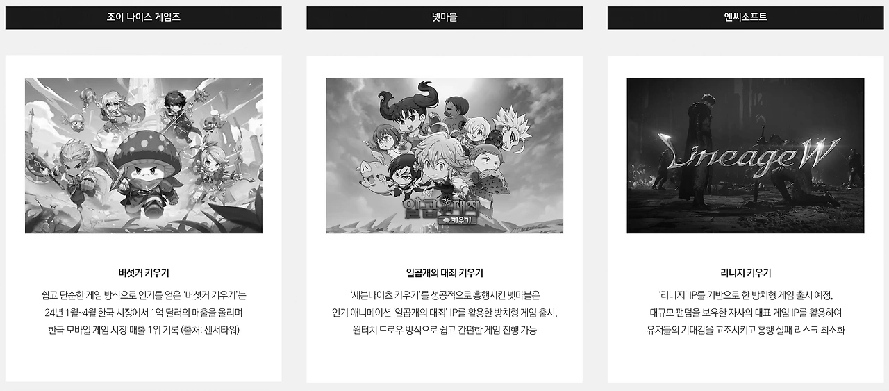 버섯커 키우기, 세븐나이츠 키우기 등 별다른 조작을 하지 않아도 캐릭터가 성장하고 재화가 증가하는 방치형 게임이 인기입니다. 플레이 중에도 다른 일을 할 수 있고, 자투리 시간을 틈틈이 활용하기에도 좋아 시간 투자 대비 높은 성취감을 얻을 수 있기 때문입니다.리니지와 같이 두터운 팬층을 보유한 대형 IP 또한 방치형 게임을 출시할 것이라고 발표하고 있어, 관련 장르의 인기는 계속될 것으로 보입니다.