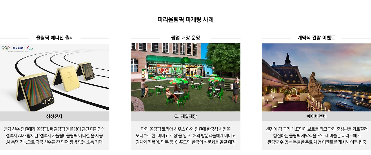 후원 기업들은 파리올림픽 기간에 소비자와의 지속적인 접점 형성을 통해 글로벌 인지도를 높이고, 긍정적인 브랜드 이미지 제고 효과를 기대
