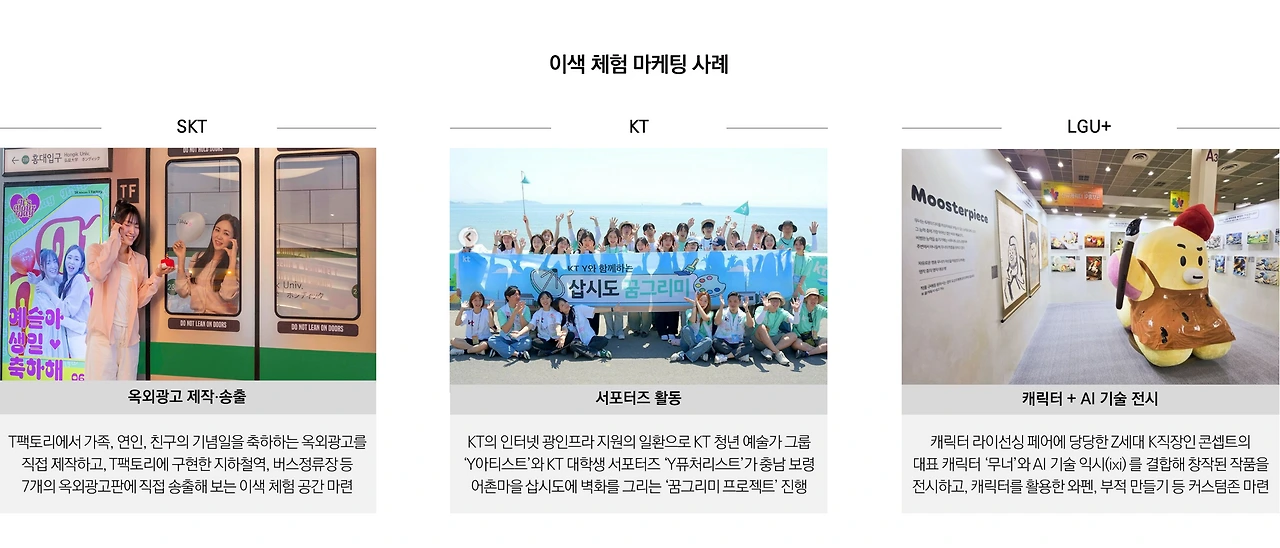 통신3사에서 온라인에서 활발히 활동하는 Z세대와의 접점을 늘리기 위해 그들을 겨냥한 체험 마케팅에 열을 올리는 중