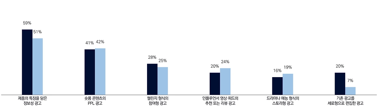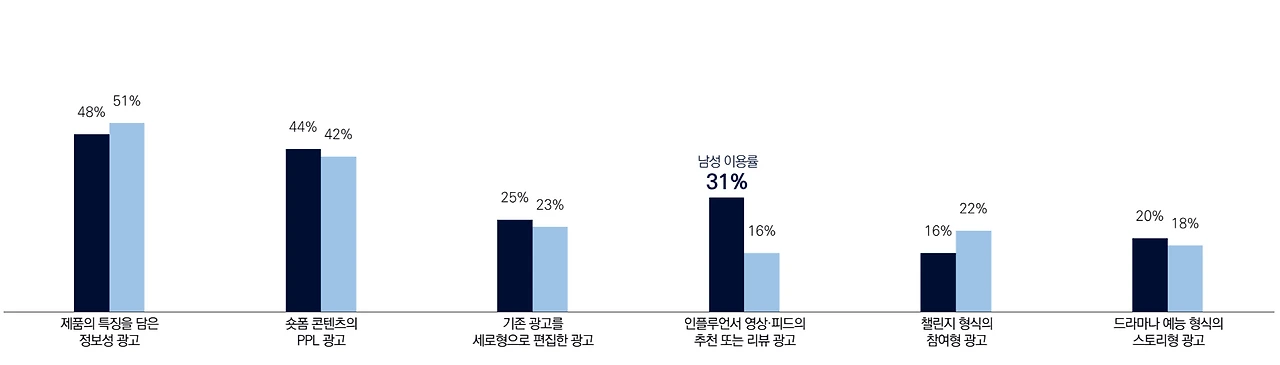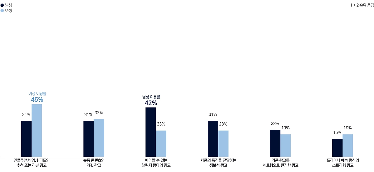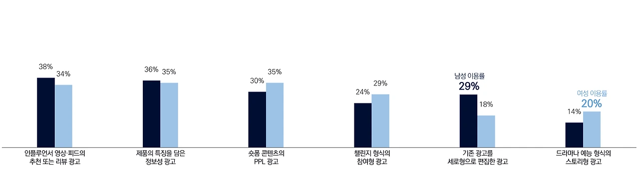 남성은 따라할 수 있는 챌린지 형태의 광고에 재미를 느끼고 관심을 가지는 것으로 나타났습니다.
