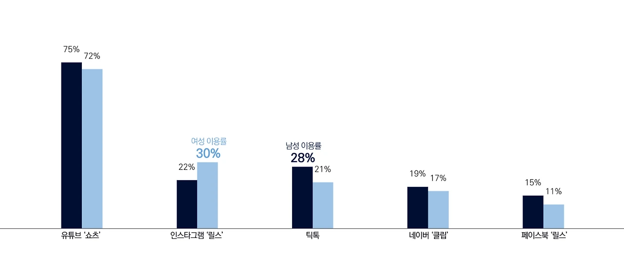 여성의 경우 남성보다 인스타그램 ‘릴스’를 더 많이 이용하는 반면, 남성은 틱톡을 더 많이 이용합니다.