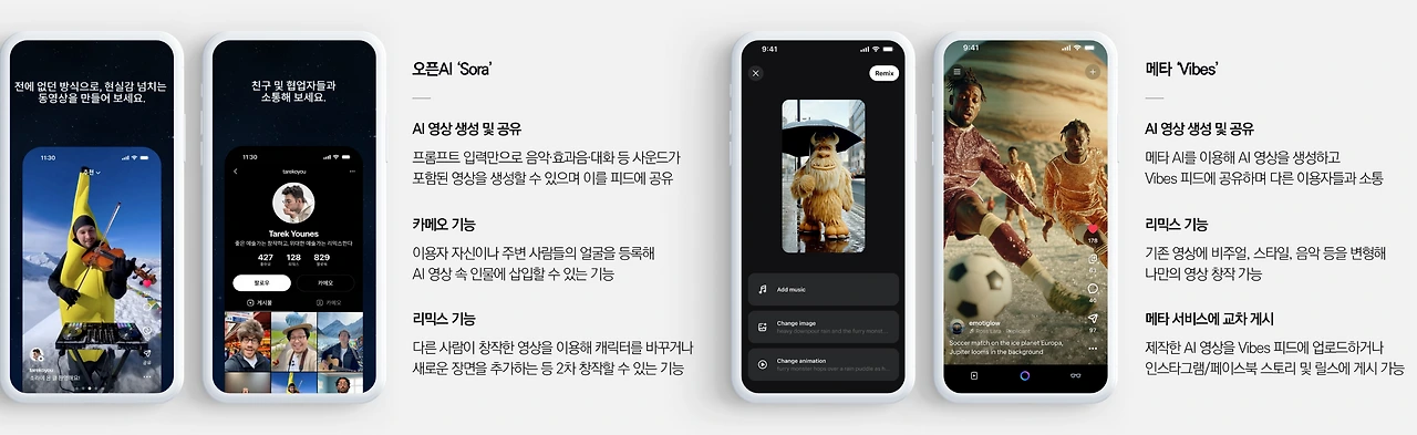 누구나 손쉽게 AI 영상을 생성할 수 있게 되자 오픈AI와 메타는 AI 영상만을 위한 SNS를 선보였습니다. 이용자들은 자신이 만든 AI 영상을 자유롭게 공유하고 타인의 콘텐츠에 반응하며 소통할 수 있습니다. 여기에 오픈 AI와 메타는 숏폼 포맷을 적용했습니다. 무궁무진한 상상을 실현시키는 AI 영상에 짧지만 몰입도 높은 숏폼 형식이 만나 더욱 강력한 주목도를 가진 콘텐츠를 만들어낼 수 있습니다. 이로 인해 AI 크리에이터의 영향력이 더욱 커질 것으로 전망되며, 향후 AI 콘텐츠가 SNS 플랫폼의 지형도까지 바꿀 수 있을지 귀추가 주목됩니다.