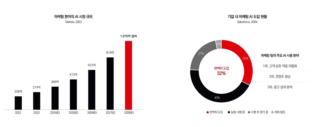 인공지능 기술이 비약적으로 발전함에 따라 AI 마케팅 시장도 함께 성장하고 있습니다. 특히, 생성형 AI가 빠른 속도로 대중화되면서 마케팅 산업에서의 AI 활용 영역이 넓어지자 시장 성장은 더욱 가속화되는 모습입니다. 이미 많은 마케터들이 AI를 이용하고 있으며, 글로벌 시장조사 기업 Statista는 2028년에는 마케팅 분야 AI 시장 규모가 1천억 달러를 돌파할 것으로 예측합니다.