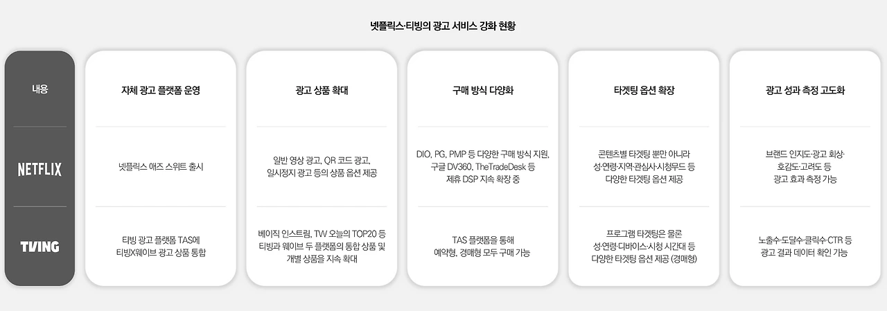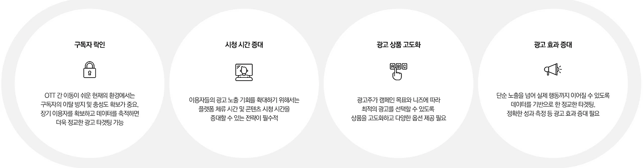 최근 넷플릭스는 자체 광고 플랫폼 ‘넷플릭스 애즈 스위트’를 공개했고, 티빙은 웨이브와 함께 통합 광고 플랫폼을 출범했습니다. 광고 플랫폼을 기반으로 구매 방식을 다양화하고 성과를 측정해, 광고 집행 편의성을 높이고 효과를 극대화하기 위함입니다. 이들은 광고 상품을 꾸준히 확대하고 있으며 타겟팅 옵션 또한 갈수록 세분화되고 있습니다. 이에 따라 더욱 정교한 OTT 광고가 가능해질 전망입니다.