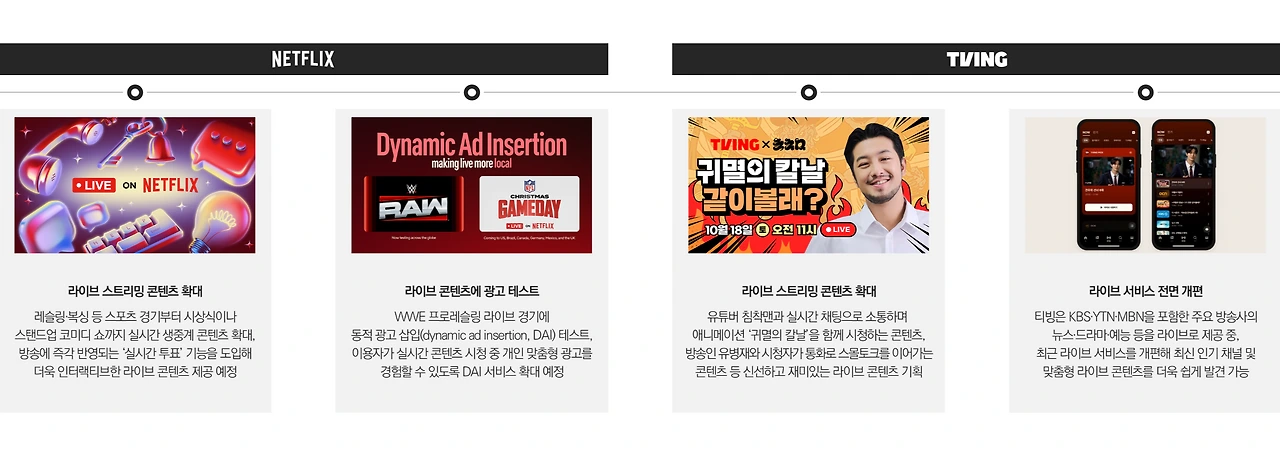 그동안 OTT 플랫폼은 이용자가 원하는 시간에, 원하는 영상을 골라 시청할 수 있는 주문형 비디오(VOD)를 주로 서비스해 왔습니다. 그러나 최근에는 라이브 스트리밍 콘텐츠를 확대하고, 여기에 투표〮채팅〮전화 연결 등 실시간으로 참여할 수 있는 인터랙티브 요소까지 접목하고 있습니다. 지금이 아니면 참여할 수 없는 실시간 콘텐츠는 시청자를 계속 집중하게 만들고, 플랫폼에 오래 체류하도록 합니다.