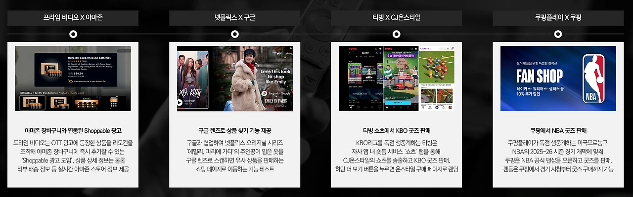 국내외 OTT 플랫폼들은 커머스와의 결합을 시도하며 OTT 광고의 구매 전환 가능성을 실험하고 있습니다. 아마존의 OTT 서비스인 프라임 비디오는 TV 디바이스에서도 쇼핑 가능한 광고를 이미 도입하였으며, 넷플릭스, 티빙, 쿠팡플레이도 자사의 콘텐츠가 상품 구매로 이어질 수 있는 방안을 고심하고 있습니다. 향후에는 시청 데이터와 구매 데이터를 연동한 전환형 OTT 광고가 확산될 것으로 전망되며, OTT 광고를 통해 브랜딩을 넘어 구매 전환까지 가능해질 것으로 기대됩니다.