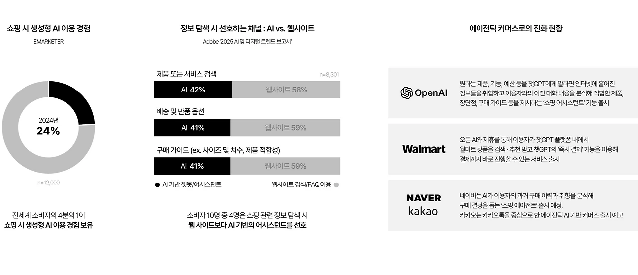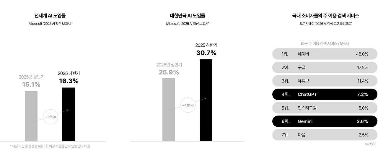 AI는 이제 일상이 되었습니다. 마이크로소프트의 조사에 의하면 2025년 하반기 대한민국의 AI 도입률은 30.7%에 달합니다. 이는 상반기보다 4.8%p 증가한 수치로, 전 세계 모든 국가 중 가장 높은 성장률입니다. 검색 서비스 이용 순위에서도 챗GPT와 제미나이가 상위권에 오르며 정보 탐색 방식의 변화가 포착되었습니다. 이제 소비자들은 AI와의 대화를 통해 상품 정보를 얻고, 비교하고, 구매 결정을 내리는 데 익숙해지고 있습니다. 다가온 AI 시대, 소비자들은 무엇에 소비하고 어떻게 소비할지 살펴보도록 하겠습니다.