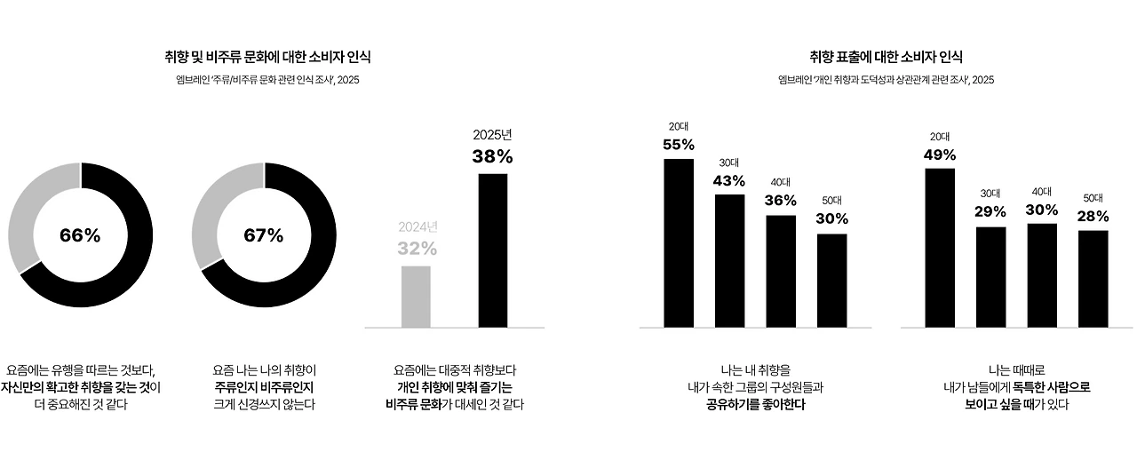 AI 알고리즘의 개인화 추천 기술이 점점 정교해짐에 따라 소비자의 취향도 더욱 강화되고, 세분화되고 있습니다. AI는 다수가 선택한 인기 상품이 아닌, 개인의 선호에 맞는 소규모 브랜드나 비주류 제품까지 제안함으로써 취향을 깊이 탐색할 수 있도록 돕기 때문입니다. 사람마다 지닌 취향이 다 달라지고 이것이 각자의 정체성이 되면서, 단순히 취향에 맞는 물건을 구매하는 것을 넘어 이를 외부로 공유하고 드러내기 위한 소비를 합니다.