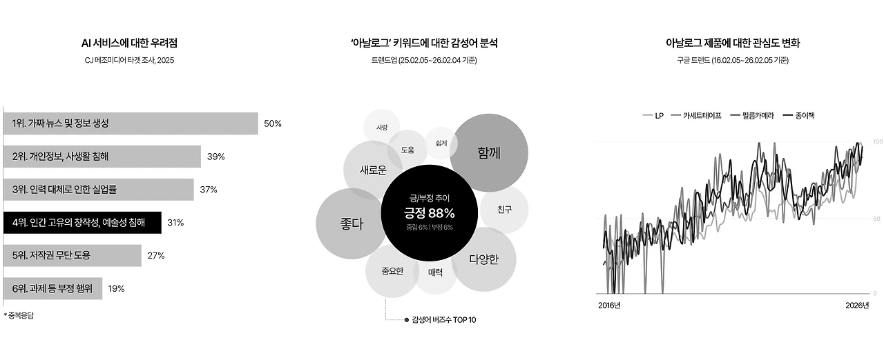 : AI로 모든 것이 쉽고 빠르게 만들어지는 환경에서 역설적이게도 소비자들은 아날로그에 매료, AI와 대비되는 느리지만 진정성 있는 것, 인간적인 것에 가치를 느끼고 소비
