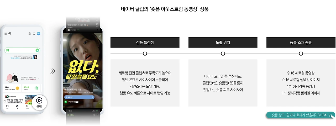 클립 광고는 숏폼 콘텐츠 사이사이에 위치하여 자연스럽게 광고 메시지를 전달할 수 있고, 국내 최대 포털에 노출되는 만큼 높은 퍼포먼스 기대