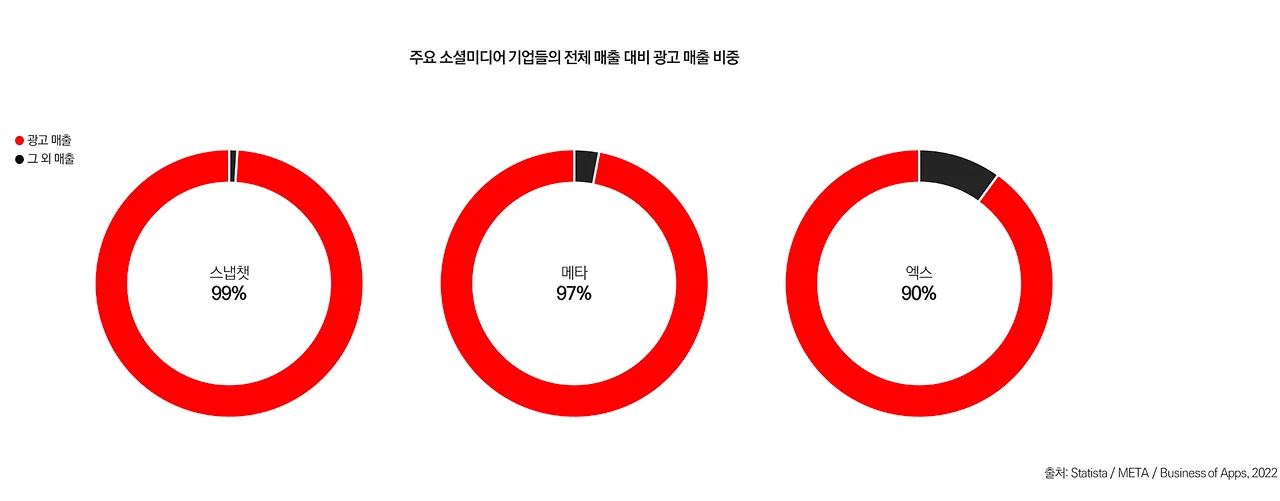 메타를 포함한 소셜미디어 기업들은 다양한 콘텐츠와 소셜 네트워킹 기능을 제공하며 대중을 사로잡았습니다. 이를 통해 방대한 양의 이용자 데이터를 확보한 소셜미디어는 맞춤형 광고 사업을 시작했고 무료 서비스의 수익 기반을 마련했습니다. 현재 스냅챗·메타·엑스 등 주요 기업의 매출 90% 이상이 광고 사업에서 발생되며 이는 기업 영속의 가장 중요한 부분을 차지하고 있습니다.