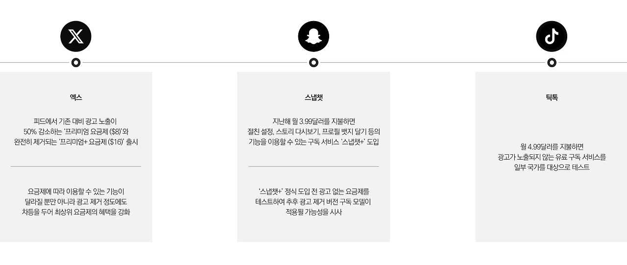 23년 10월, 엑스 또한 광고가 노출되지 않는 프리미엄 요금제를 출시했으며 스냅챗과 틱톡도 광고 없는 구독 서비스를 테스트하고 있습니다. 또한 일부 기업들은 구독자에게 광고 제거 기능뿐만 아니라 다양한 독점 기능을 제공함으로써 유료 구독으로의 전환을 적극 유도하는 모습입니다. 앞으로의 소셜미디어 플랫폼들은 유료 서비스를 더욱 강화하고 구독자를 확보하는 데에 힘을 쏟을 것으로 보입니다.