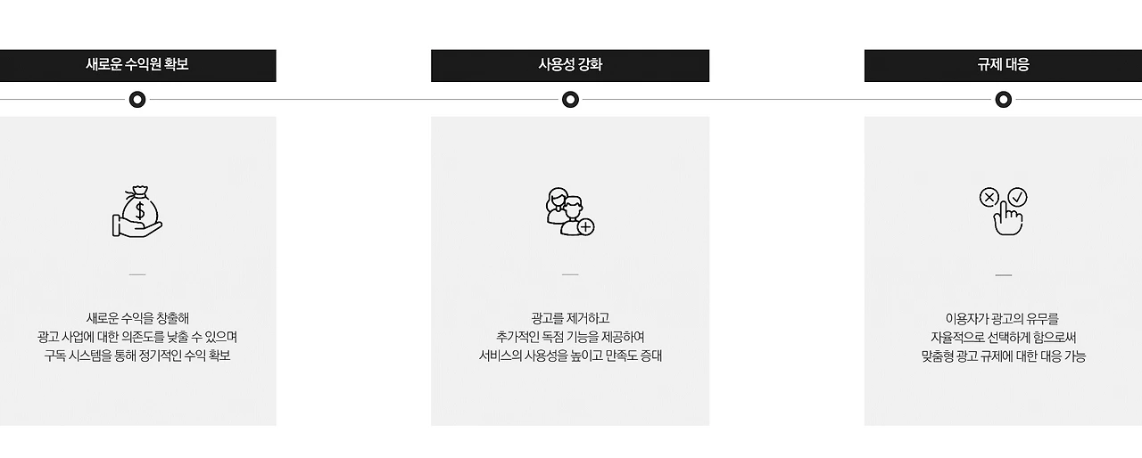 지나친 광고 의존도를 낮추고 수익 구조를 다변화하기 위해 소셜미디어가 선택한 전략은 바로 SNA, 즉 광고 없는 구독 모델입니다. 개인정보 제공과 맞춤형 광고 시청을 원치 않는 사람에게는 유료로, 동의하는 사람에게는 무료로 서비스를 제공하는 것입니다. 구독을 통해 새로운 수익을 창출하는 동시에 맞춤형 광고에 대한 법률적 규제에도 대응할 수 있어 현재의 위기를 타개할 주요 전략으로 부상하고 있습니다.