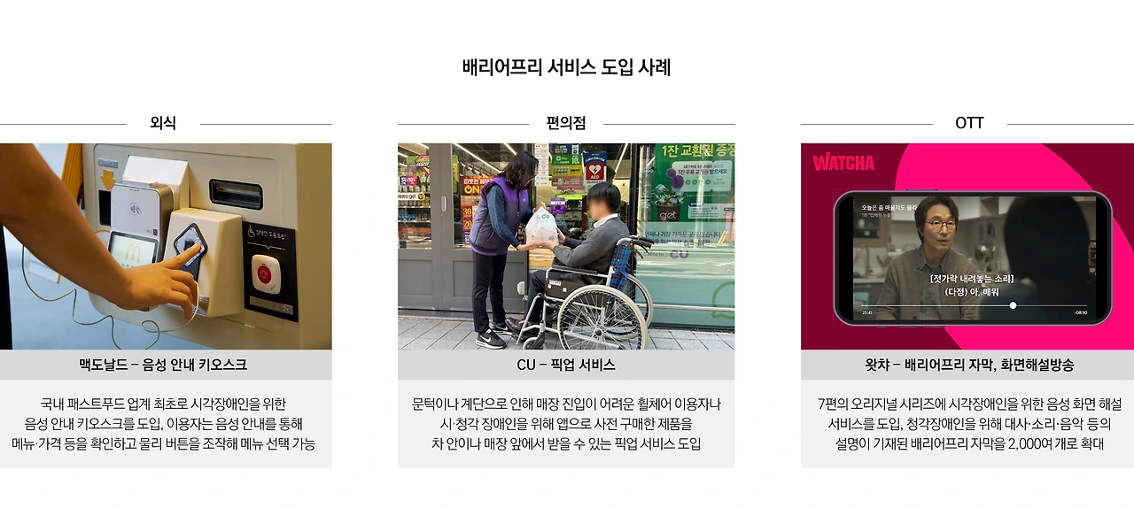 장애인·노인 등 사회적 약자도 차별 없이 자사의 제품 또는 서비스를 이용할 수 있도록 배리어프리(Barrier-free) 서비스를 도입하는 사례가 증가