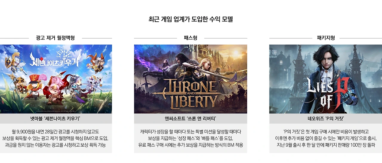 확률형 아이템에 대한 제도적 규제가 강화되고 이용자들의 부정적 여론도 커지자, 게임업계는 최근 신작에 새로운 수익 모델을 도입하는 추세