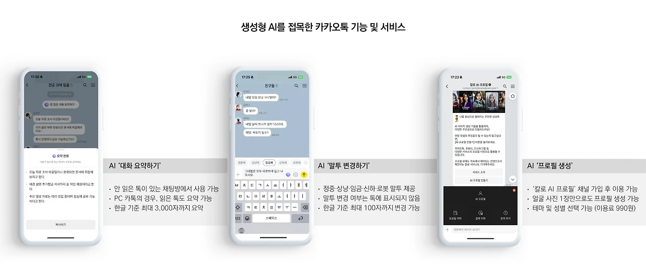 읽지 않은 대화 내용을 요약하고, 대화 상대에 맞추어 말투를 변경하는 AI 기능 실험(베타 서비스)과 AI 프로필 생성 서비스를 출시