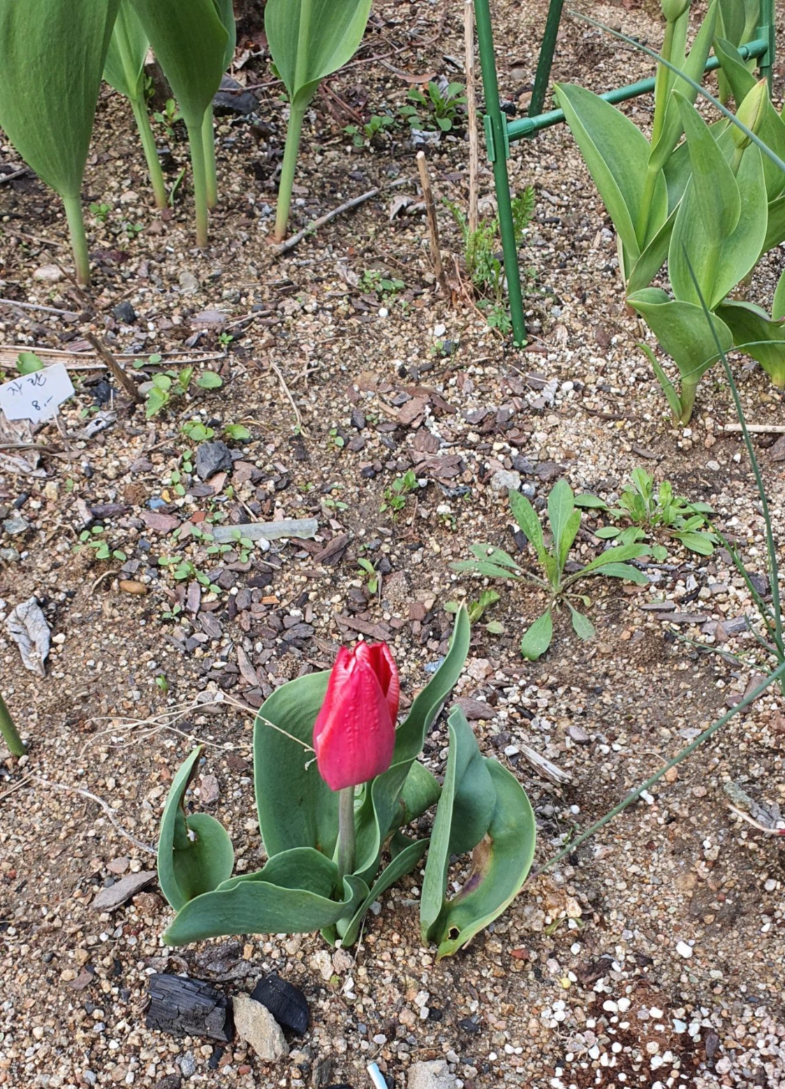 미처 발견하지 못한 튤립 알뿌리들이 반란을 일으켰다. 작년 튤립이 한창 피어난 아름다운 모습을 보고서 화단에 있는 튤립 줄기를 모두 잘라냈다. 잘라낸 빈자리에 다른 아이들을 심기 위해 알뿌리는 모두 캐냈다고 생각했다. 그런데 우리가 알지 못하는 알뿌리들이 있었는지 봄이 되자 스스로 저렇게 잘 자라 꽃을 피워 올린다. 빨갛게 피어나는 튤립은 몇 개 없었는데 말이다.