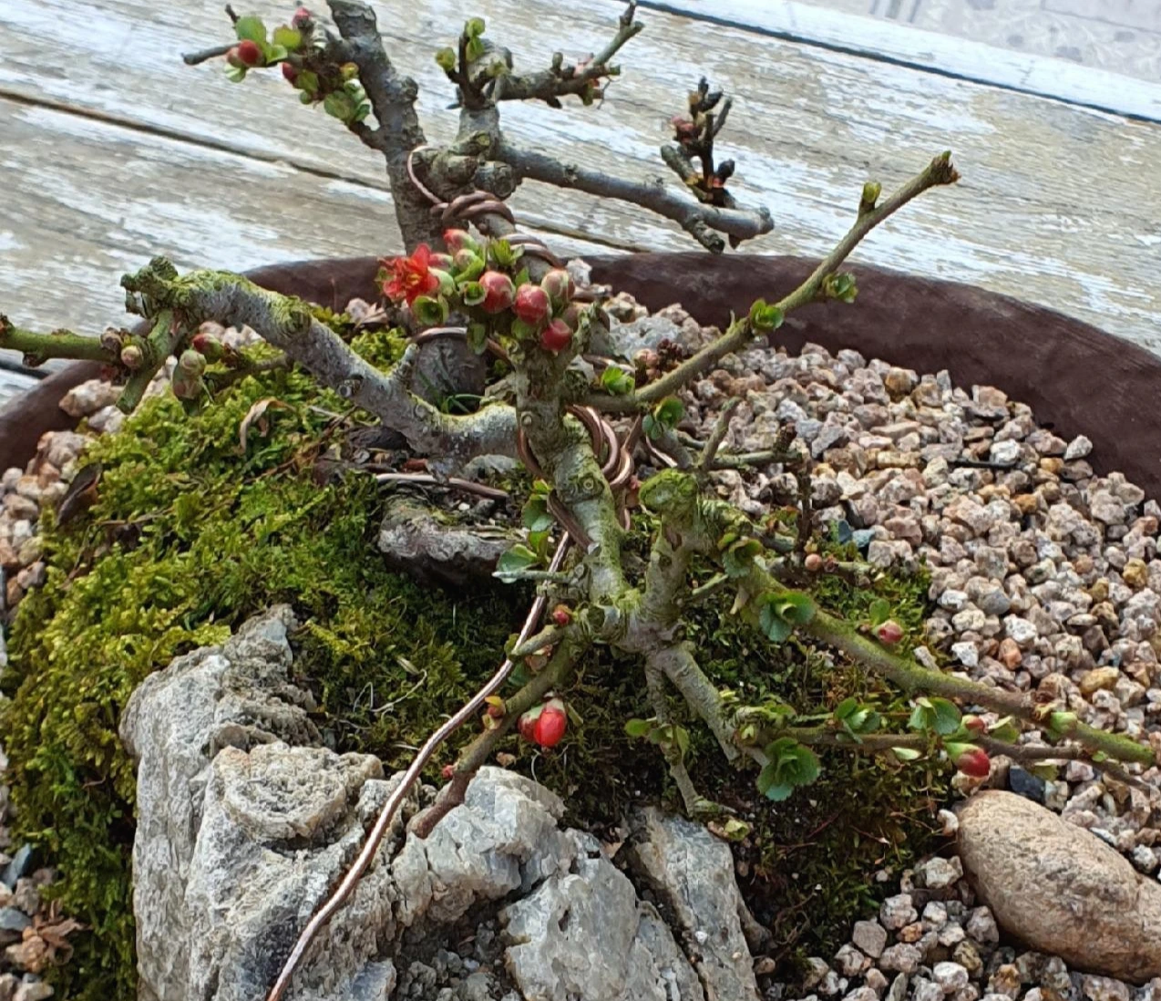 사실 이 꽃은 우리 집에서도 오랜 시간을 머물며 살아있는 아이다. 명자나무과의 나무인데 이름에 대한 정확한 기억이 없다. 화분에 분재로 키우고 있던 아이다. 5년 이상 꽃을 못 피워 무성한 잎만 바라보다 세력도 약해지는 것 같아 화단으로 옮겨 심었던 아이다. 여전히 잎만 무성할 줄 알았던 이 아이가 어느 순간 꽃을 피워 올린다. 그것도 아주 많은 양의 꽃과 작지 않은 크기의 화려함을 무장한 채 말이다.