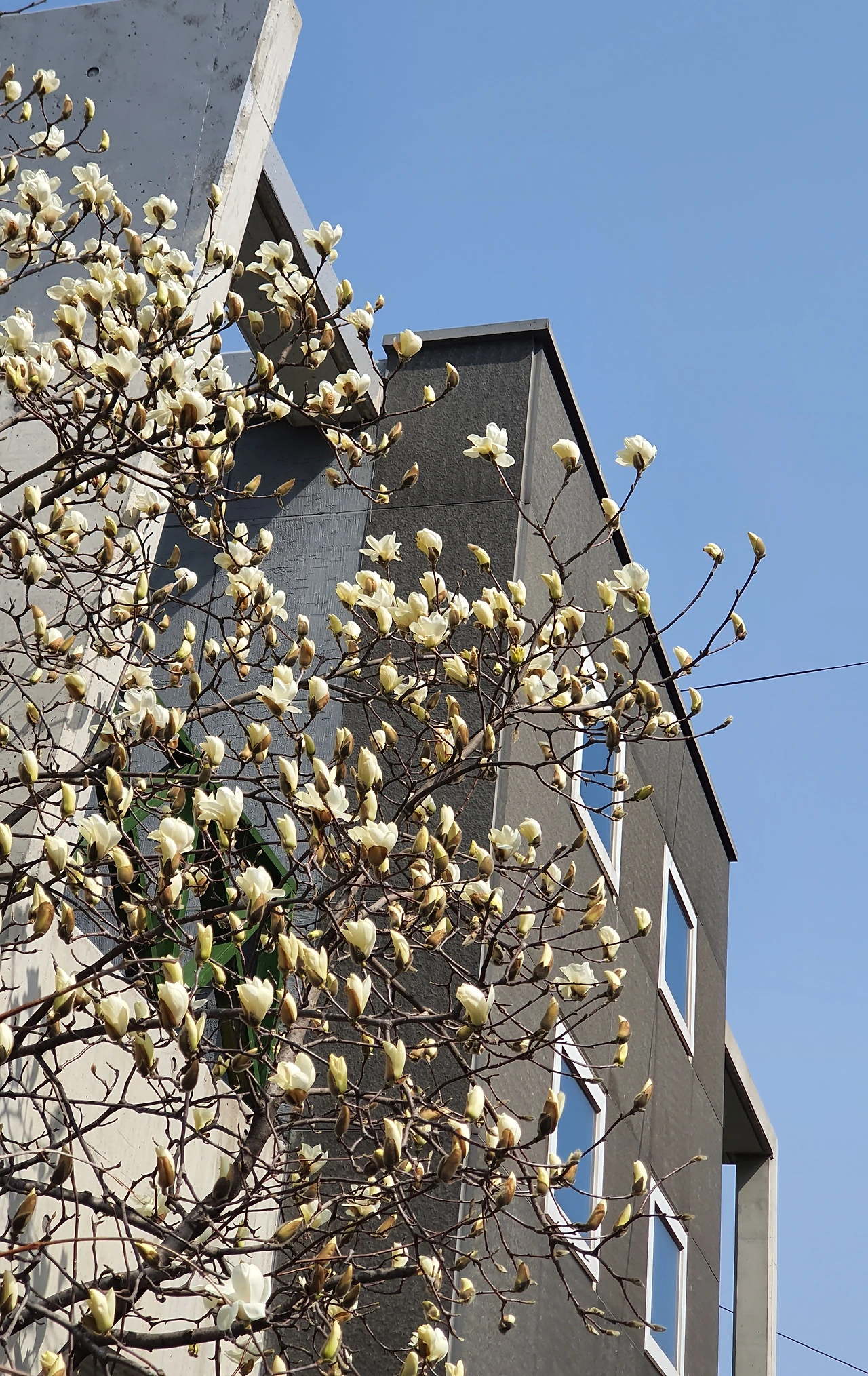 커다란 목련나무를 자르게 된 사연이 있다. 워낙 크게 자라다 보니 나무가 옆집으로 가지를 뻗었고, 옆집 벽에 닿게 되자 옆집에서 잘라 달라고 부탁했다. 나무에 올라가 자르다 보니 나무 무게 때문에 나무가 갈라지면서 절반 이상을 자를 수밖에 없었다. 남아있는 줄기도 터진 쪽을 자르고 나니 가지가 몇 개 안 남았던 것이다. 그랬던 목련이 대견하게도 얼마 되지 않는 가지에 하얗게 꽃을 피웠었다. 풍성하던 목련꽃이 초라해 보이는 모습이 짠했던 터라 더 기억에 많이 남았다.