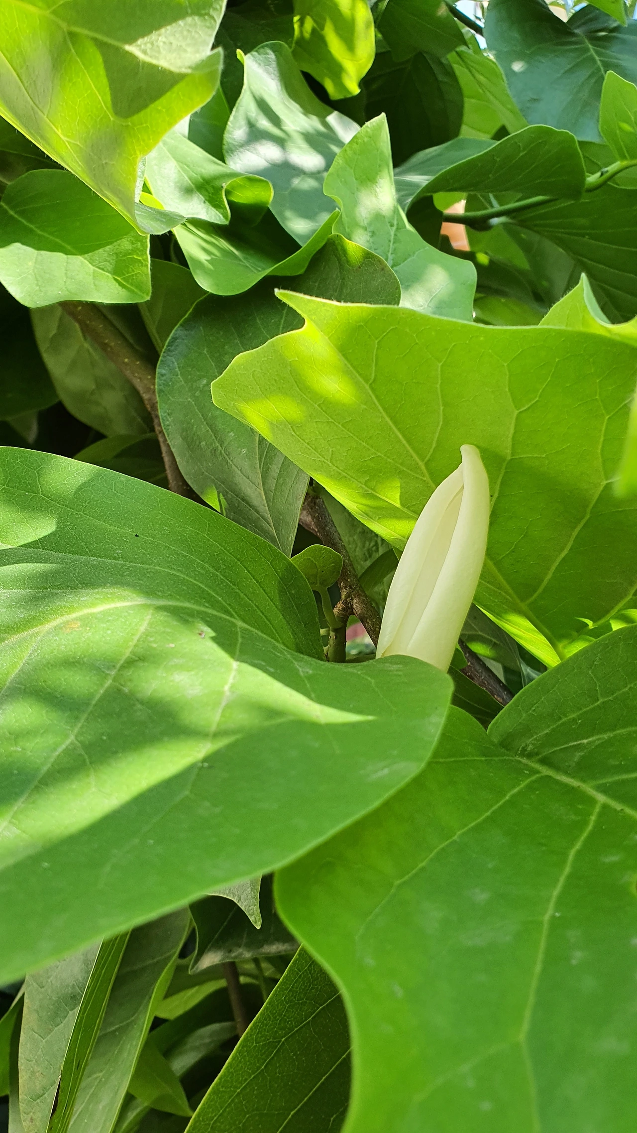 무심코 바라본 목련의 푸르름에 이른 봄 잘라버린 나무줄기가 생각이 났다. 자르지 않았더라면 더 풍성한 모습으로 그늘을 만들어 줄 수도 있을 텐데 하는 아쉬움이 남았다. 그러다 문득 짙은 초록의 커다란 잎 사이로 하얀 뭔가가 눈에 띈다. '뭘까?' 하는 호기심에 살며시 다가갔다. 목표물에 가까워질수록 낯선 흰색의 정체가 선명하게 보인다. 하얗게 피어나는 꽃이다. 잎이 나기 전 목련이 하얗게 피는 모습은 거부할 수 없는 현실이다. 풍성한 목련 잎 사이로 목련꽃이 핀다는 말은 듣지도, 보지도 못했던 풍경이다.