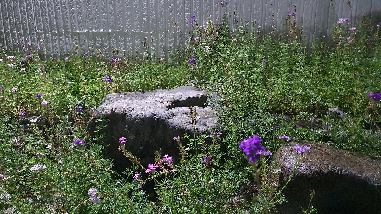 이제 오픈한 지 얼마 되지 않은 새내기 카페다. 아직 조경이 자리잡기 전이다 보니 어쩌면 휑한 기운마저 느껴지는 입구다. 야생화들이 무성하게 자라나는 우리 집 화단만 바라보던 내 눈에는 다소 어색해 보이기는 하지만 새롭게 단장되는 카페의 신선함은 또 다른 맛을 느끼게 하는 것 같다. 가까이 다가가 쪼그리고 앉아 키 작은 아이들의 모습을 감상해 본다. 겹 물망초의 앙증맞은 눈인사가 촉촉하게 젖은 지면의 흙내음과 섞여 반갑게 다가온다.