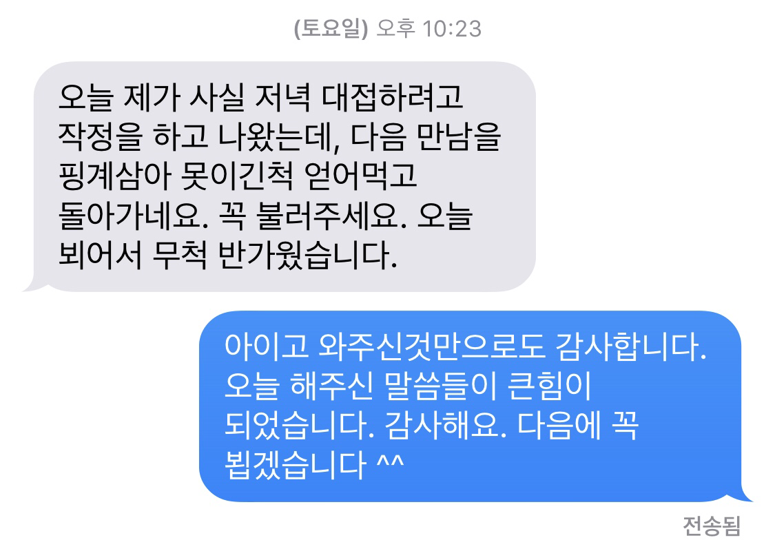 방송을 마치고 근처 술집에서 뒤풀이를 했다. 즐겁게 놀고 취하고 이야기를 나누고 헤어지려는데 한 청취자 분이 본인이 저녁 식사를 사겠다고 하신다. 그래도 그건 아니다 싶어 마케팅 어벤저스 회비로 내겠다고 했다. 그분은 못 이기는 척 계산을 거두셨다. 그리고 인사를 나누고 헤어진 뒤 문자가 왔다. 저녁을 사려고 작정하고 나왔으나 얼굴을 또 보고 싶어 미루셨다고. 다음번에는 저녁을 살터이니 꼭 불러달라고.