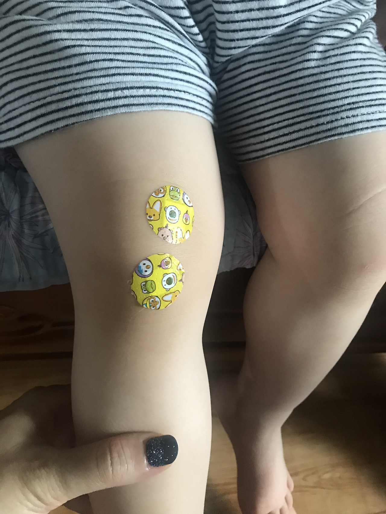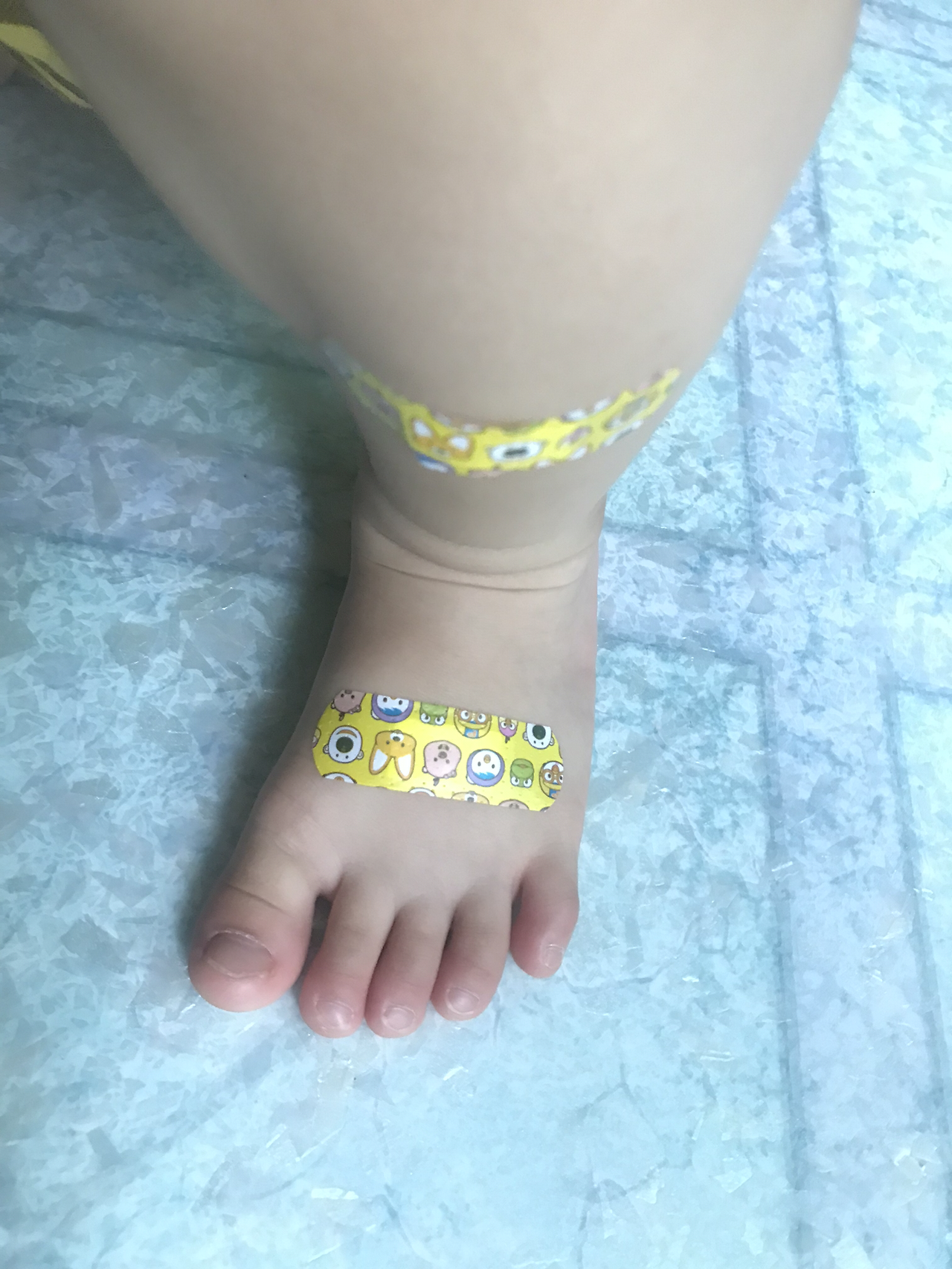 밴드를 붙이는 순간 첫째는 다리를 움직일 수 없다고 합니다. 둘째는 밴드를 붙인 팔과 다리를 들고 다니고 어느새 다리를 절뚝이기 시작하는 것입니다.