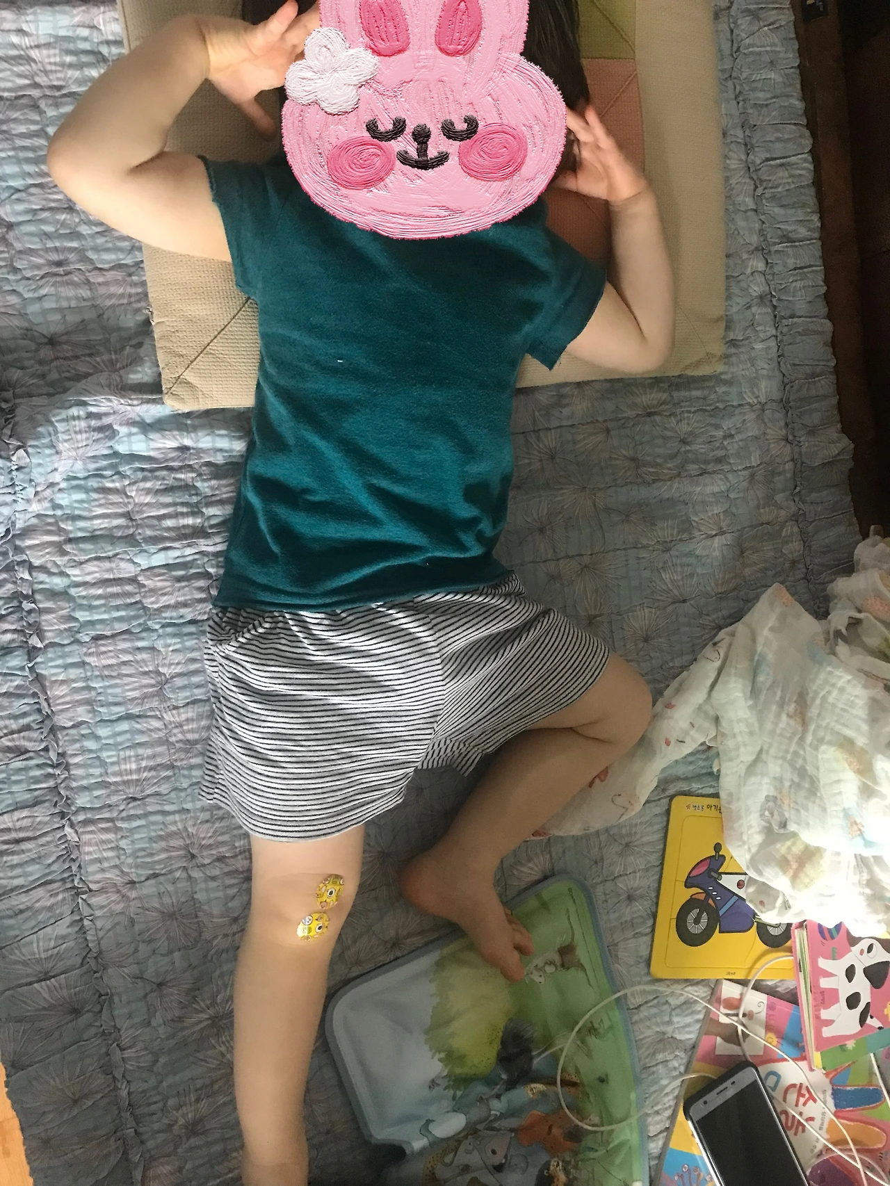 심지어 첫째는 다리가 너무 아프다며 다리 쪽에 이불을 덮기도 하고 드러눕기도 했습니다. 이후 다리를 움직일 수 없으니 자신을 안고 가라고 손짓까지 합니다.