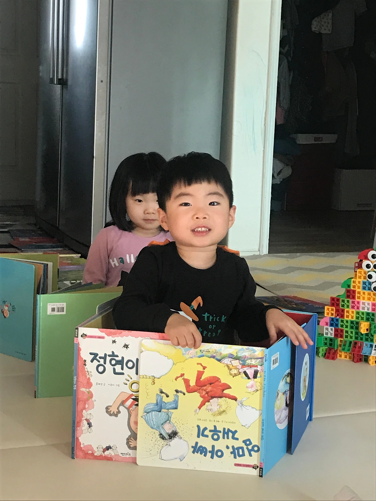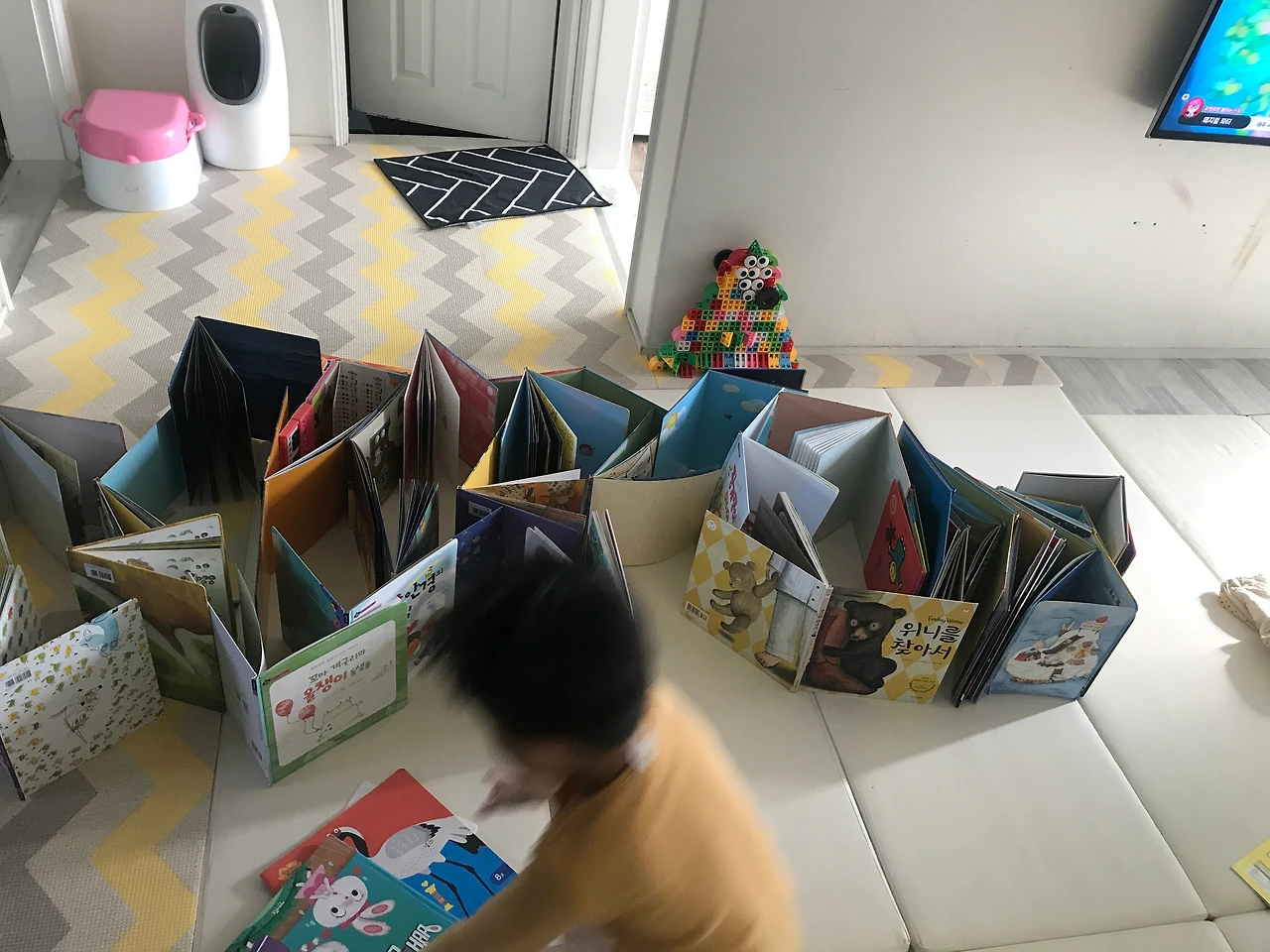 아이들의 책도 처음엔 자꾸 죽~~죽~~ 찢으니 기분이 별로 안 좋았습니다. 돌 전까지는 뭘 모르니 어쩔 수 없다 생각했고, 돌이 지나고 나서는 알려주면 되겠지 했습니다. 하지만 아니더군요. 아이들의 그림책은 엄마, 아빠가 읽어주는 책으로만 여기고 가끔 자신들이 들춰보기는 하나 큰 의미는 없는 것 같아요. 요즘 저희 둥이들이 그림책으로 놀이를 하는데 일렬로 깔아놓고, “엄마! 이건 다리야. 지나가는 거야.”