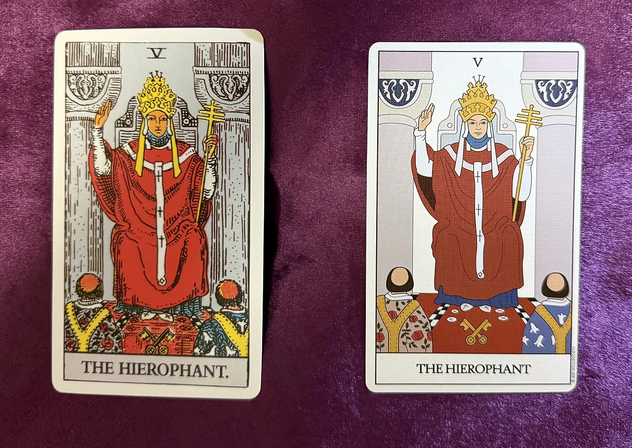 책상 위의 두 장의 The Hierophant를 다시 본다. 유니버셜 웨이트의 엄숙한 의식과 소울웨이트의 따뜻한 포용.
