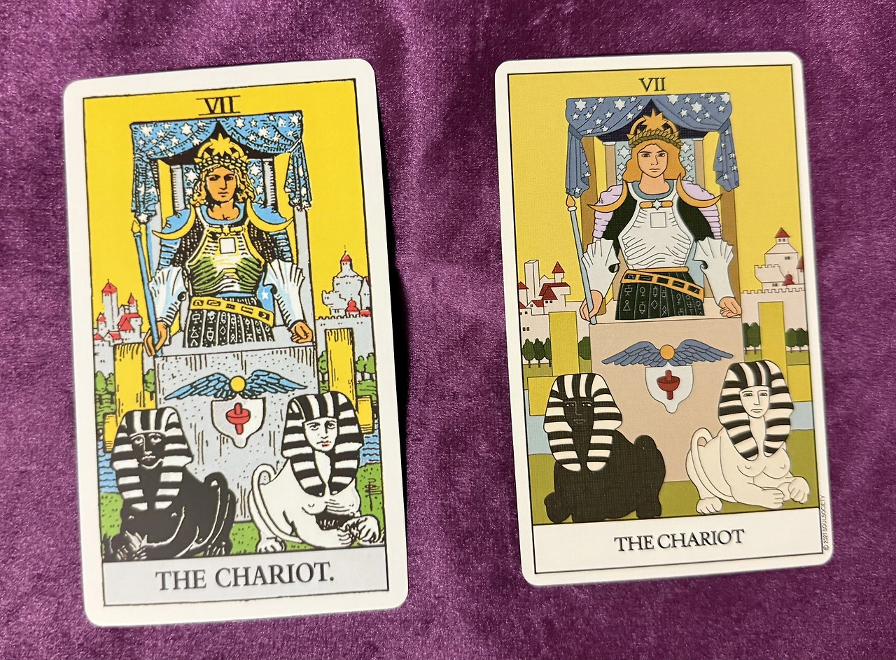 소울웨이트 덱의 전차는 더 역동적이다. 갑옷이 빛나고 스핑크스들이 더 생동감 있다. 배경의 도시는 문명을, 흐르는 강은 감정의 흐름을 보여준다. 그는 두 세계를 모두 다스릴 줄 안다.