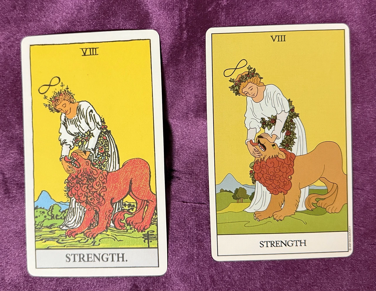 The Chariot은 두 스핑크스를 의지로 조종했다. Strength는 한 마리 사자와 사랑으로 하나가 된다.