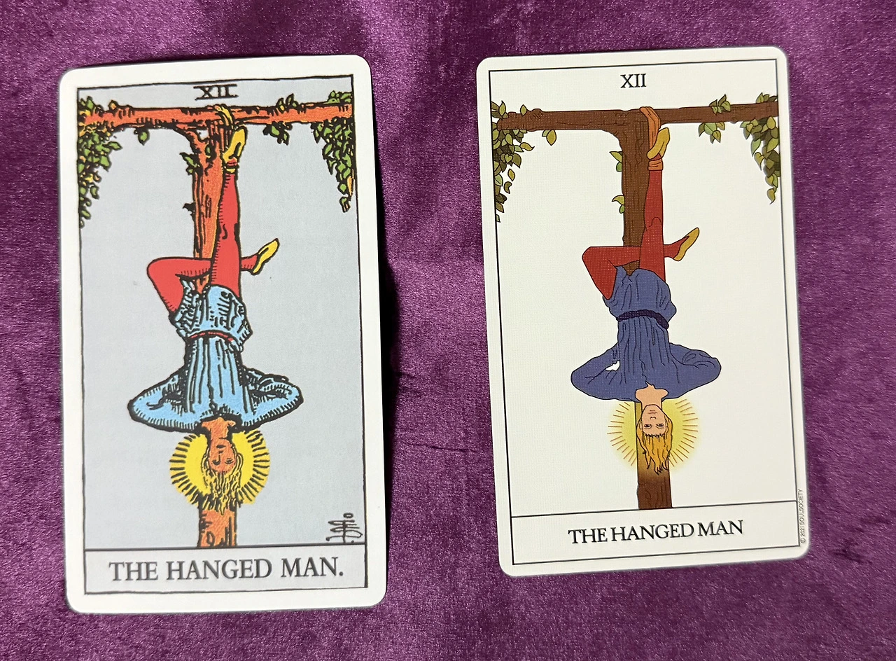 책상 위의 두 장의 The Hanged Man을 다시 본다. 유니버셜 웨이트의 고요한 서렌더와 소울웨이트의 평화로운 수용.