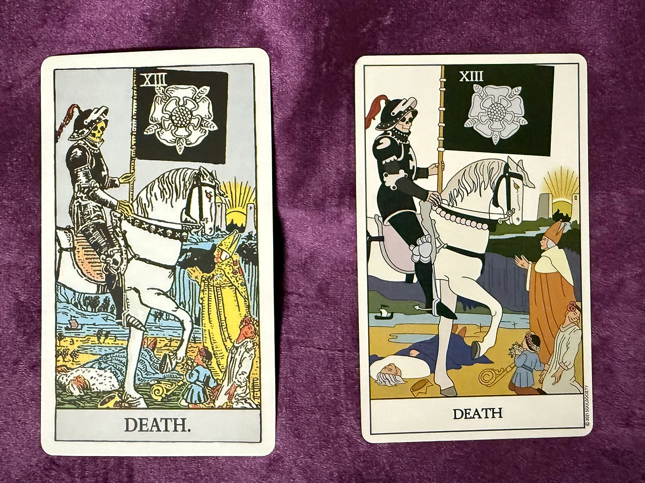 유니버셜 웨이트 덱을 펼친다. 검은 갑옷의 해골 기사가 백마를 탄다. 백마—순수한 영혼의 힘, 멈출 수 없는 시간의 전진. 기사의 손에는 검은 깃발, 그 안의 흰 장미는 미스틱 로즈(Mystic Rose)—생명, 재생, 영원한 순환.