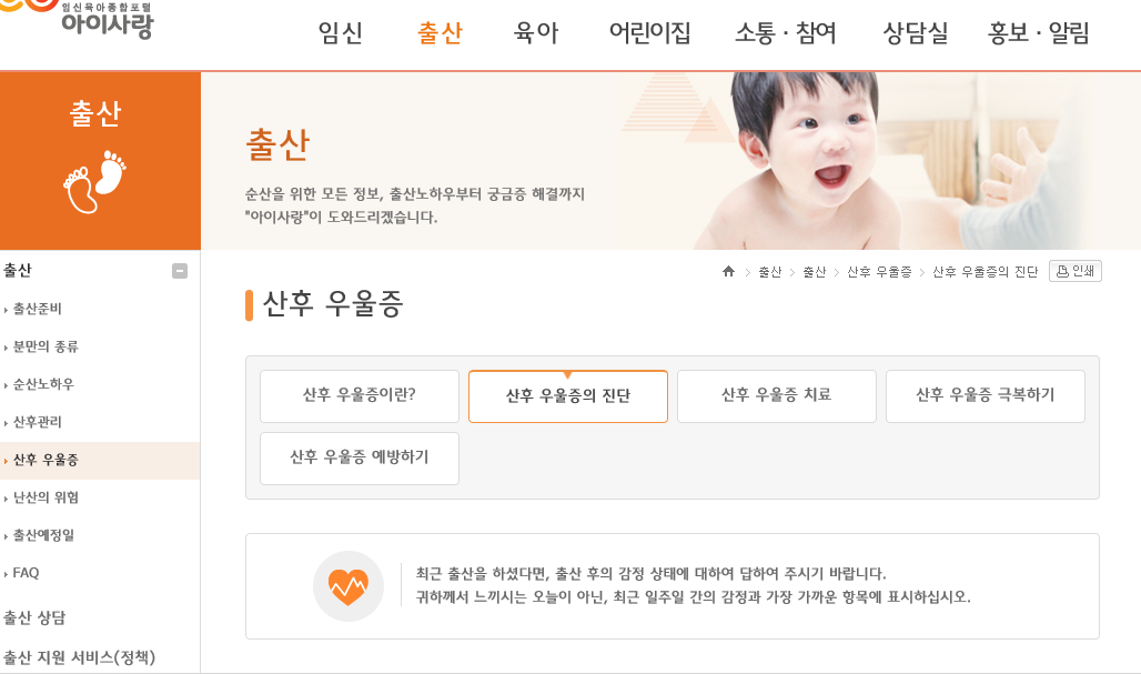 산후 우울증 보통의 증상은 기분이 자꾸 가라앉아 눈물만 나고 자신이 무가치하게 느껴지며 불안, 초조하여 잠시도 편안히 있지 못하는 거라고 합니다. 그래서 잠도 잘 안 오고 식욕도 없고 부정적인 생각들이 많이 들기도 합니다. 이러한 증상이 심해지면 자살충동으로도 발전할 수도 있습니다. 이 시점까지 가지 않도록 각별히 신경을 써야 합니다. 임신육아종합포털 사이트 아이사랑에 들어가면 임신, 출산, 육아, 교육(어린이집) 관련한 정보들을 얻을 수 있습니다. 그중에서 산후 우울증도 따로 관리하는 부분들이 있어 몇 자 내용을 옮겨봅니다.