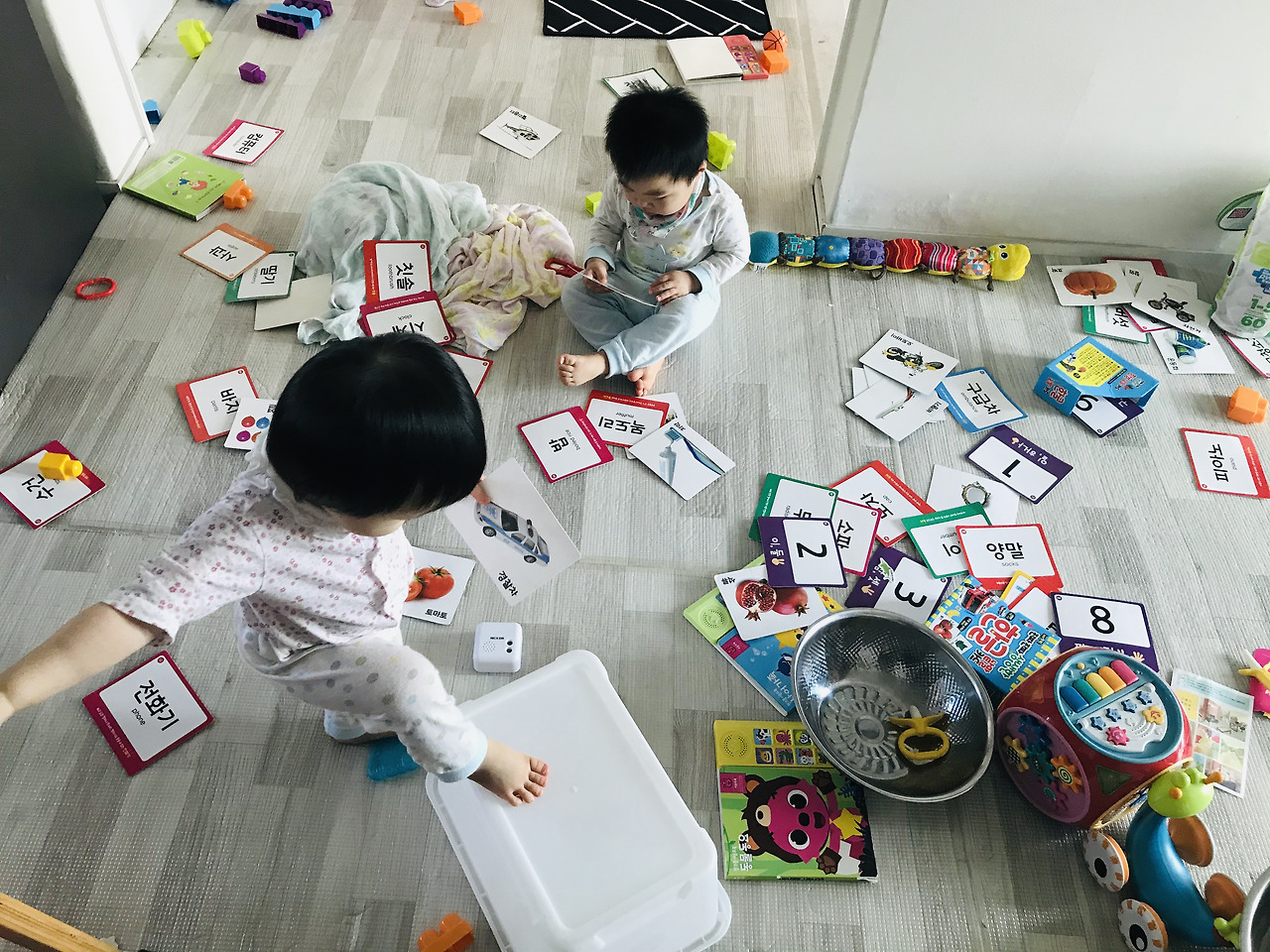 18개월인 아이들은 아직 말문이 트이지 않았습니다. 수다스럽지 않은 엄마는 조금씩 불안해지고 있습니다. 어떻게든 말을 가르쳐보고자 낱말 카드를 구입을 했습니다. 처음엔 관심조차 두지 않아 사용을 못하고 있다가 사용은 해봐야 할 것 같아 한번에 5장씩 꺼내어 보여줬습니다. 낱말 카드 통째로 받으니 부담스러웠나 봅니다. 조금씩 시도를 하니 익숙해져서 일주일 정도 지난 후 모든 카드를 줬습니다. 하지만 아이들은 차근히 보는 것이 아니라 모두 펼쳐놓은 후 눈에 가는 것을 골라 자세히 보고는 하더라고요. 옆에서 단어를 여러 번 말을 했지만 반응이 별로 없어 의기소침해 있었습니다.