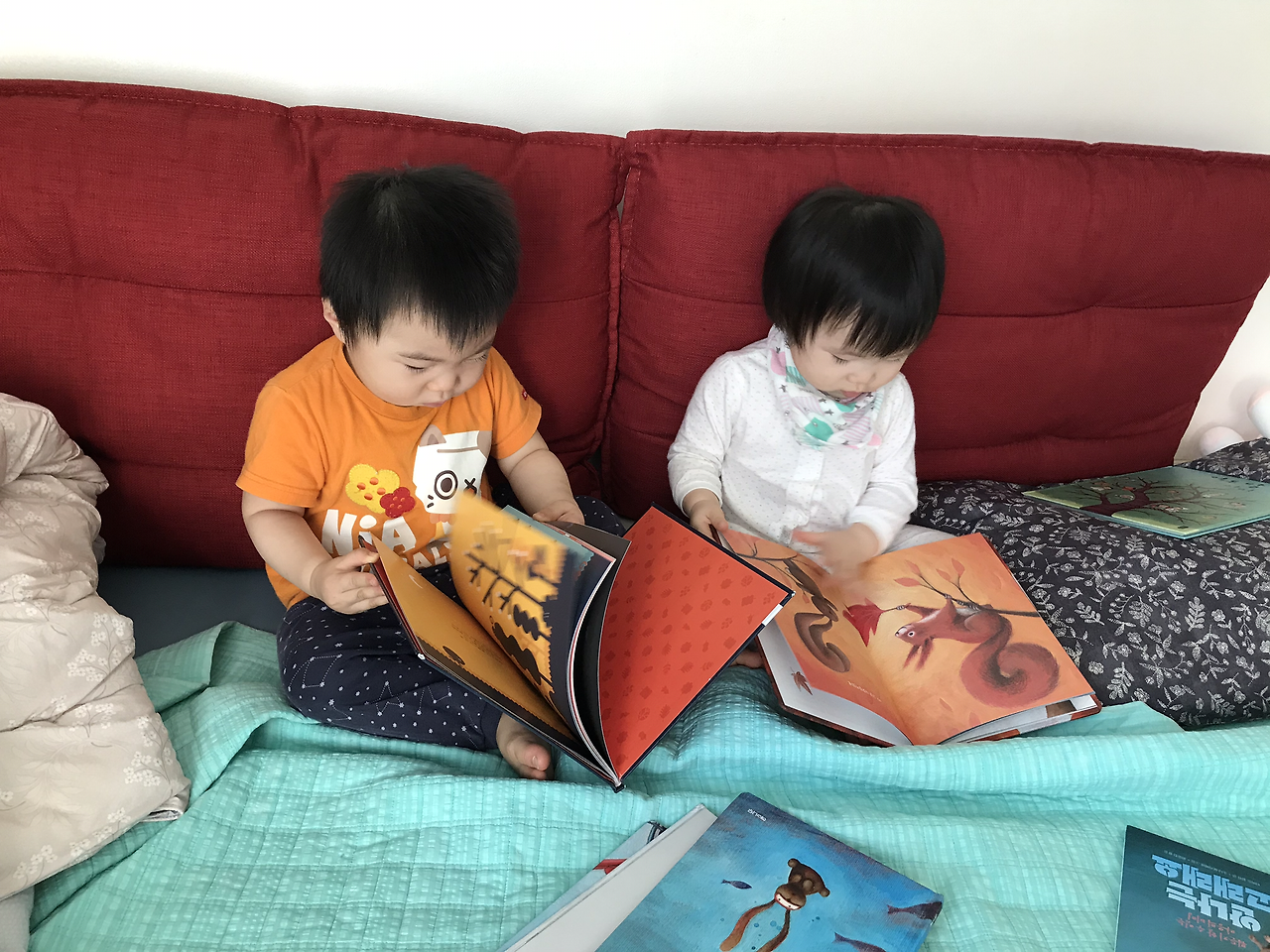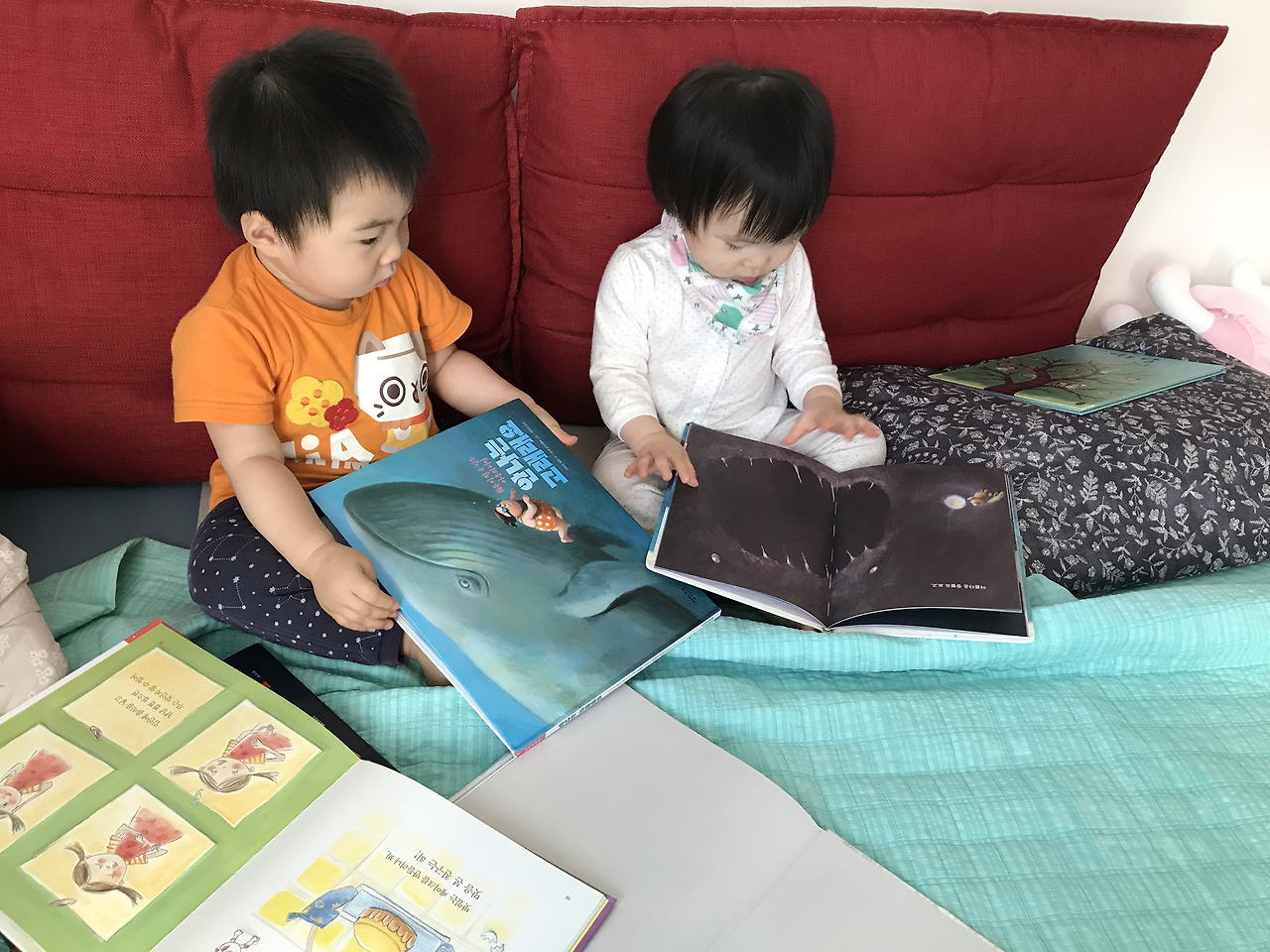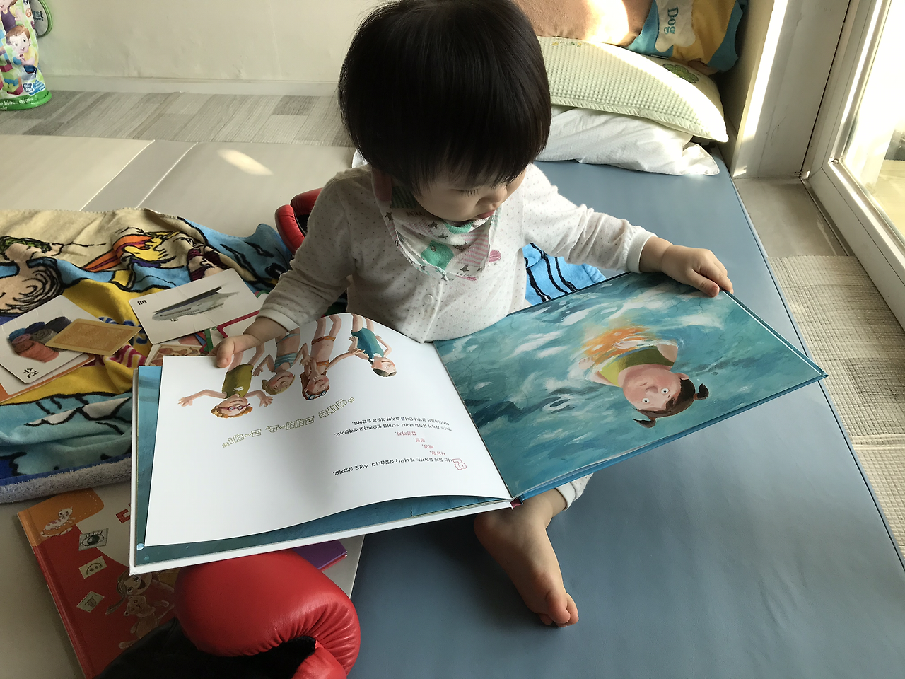 어! 생각 외로 잘 봅니다. 책을 이해하는 것이 아닌 책장 넘기는 게 재밌는 아이들. 알록달록 색이 있는 그림책을 제법 잘 봅니다. 그동안 괜한 걱정을 했나 봅니다. 그래도 건네고 나서 가끔 확인을 해봅니다. 책이 무사한지.