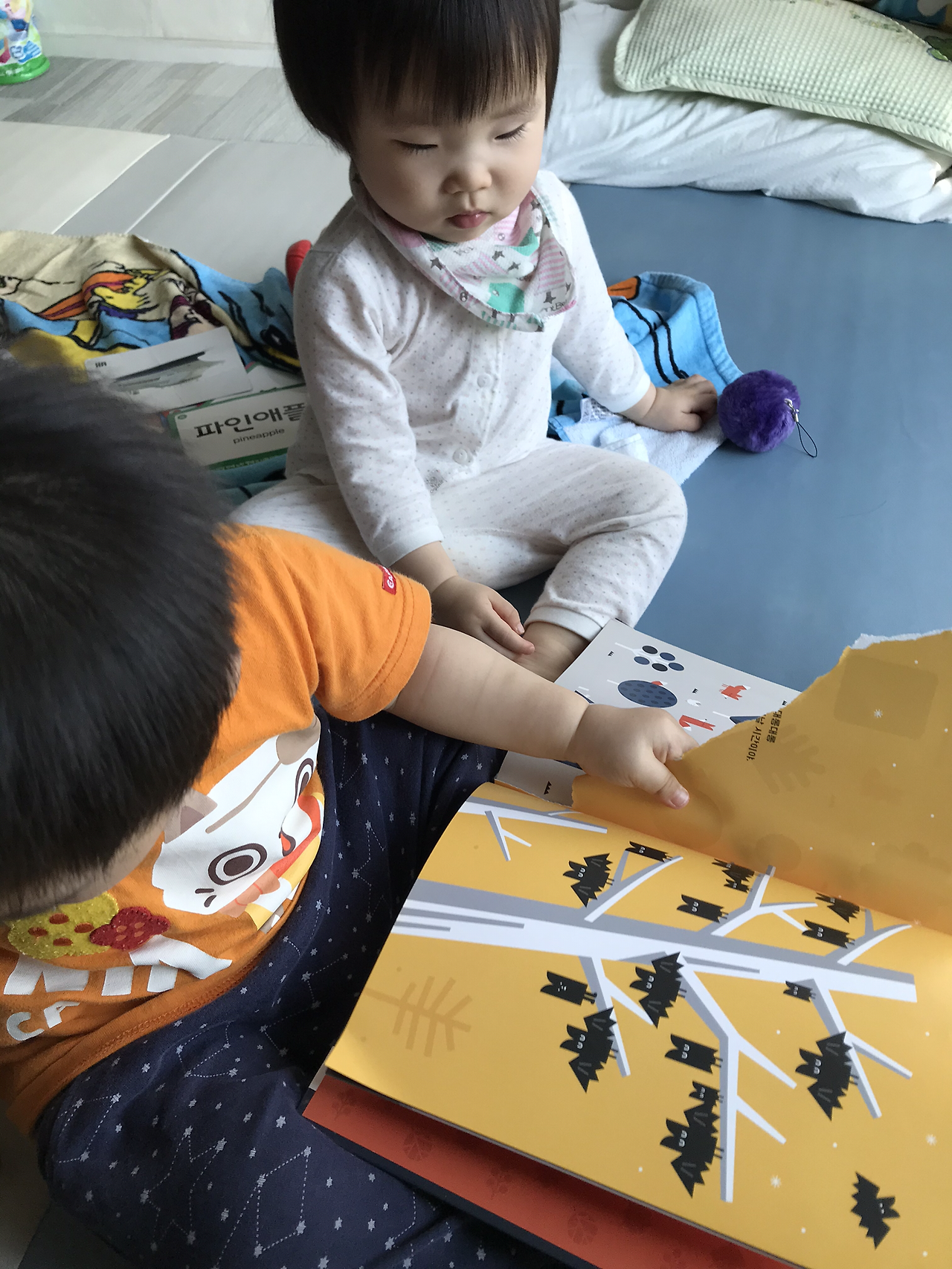 제가 싫어하는 일 중 하나 책을 손상하게 하는 행위들입니다. 책을 접거나 밑줄을 긋는 것조차 싫어합니다. 공부하는 서적 외에는 절대로 그러질 않습니다. 둥이들과 집에서 이것저것 하면서 노는데 이제는 같은 장난감, 같은 사운드북으로 놀게 되니 새로운 것이 없어 고심하던 차에 제가 소장하고 있던 그림책을 보여주는 겁니다. 고민을 엄청 했습니다. 보드북도 시간이 지나면 제대로 남아 있지를 않는데 괜찮을까? 며칠을 고민을 했던 것 같습니다.