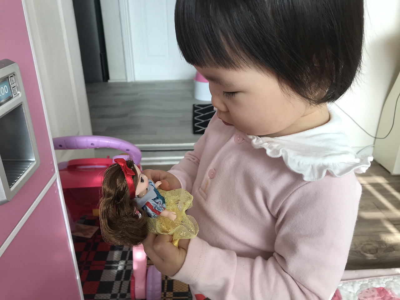 처음 보는 인형에 관심이 없는 것 같더니 어느새 좋아하더라고요. 온전히 자신만의 장난감을 가져 본 것이 좋았을 거라 생각됩니다. 비록 하루 동안이었지만 말이죠. 인형의 얼굴을 자세히 살펴보더니 무서운 괴물 인형 취급을 하더라고요. 눈이 크고 머리카락이 있어서인지 무서워하더라고요. 이후로는 백설공주 인형은 진열대에서 내려올 일이 없었습니다. 언젠가는 가지고 놀거라 기대를 해봅니다.