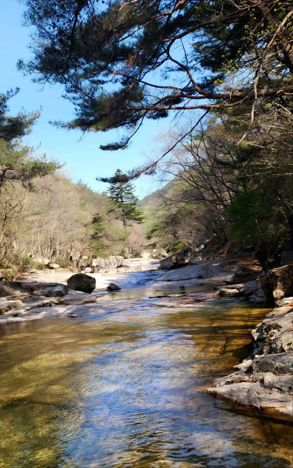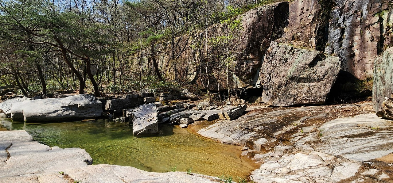 낮고 너른 암반들이 계곡을 따라 이어지고 있었다. 계곡물은 암반 사이를 미끄러지듯 돌면서 흐르고 햇빛에 반사되어 반짝이고 있었다. 숲에 둘러싸인 계곡은 사람들이 없어 적막하였다. 이제 걷기를 시작했는데 벌써 앉아서 하염없이 흐르는 물만 보고 있어도 좋을 것 같았다.