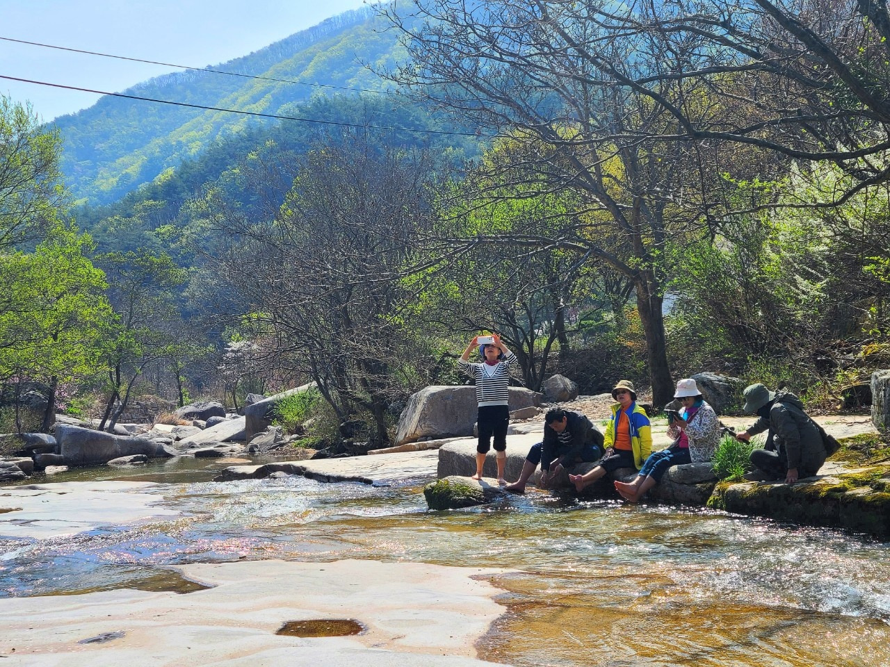 일행들은 이미 발을 물속에 담그고 쉬고 있었다. 나도 앉아서 옆에 있는 사람들과 물속에서 발을 나란히 세우고 물장구를 치며 놀았다. 마치 어린 시절로 되돌아간 듯 즐거웠다. 계곡의 물은 차가워 발이 시렸지만, 기분이 상쾌하였다. 사람들의 웃는 모습이 환하게 빛나고 있었다. 마음의 먼지도 씻고 몸의 피로도 씻는 순간이었다. 세심과 세신을 함께 하였다.