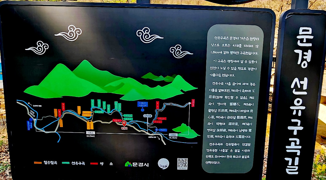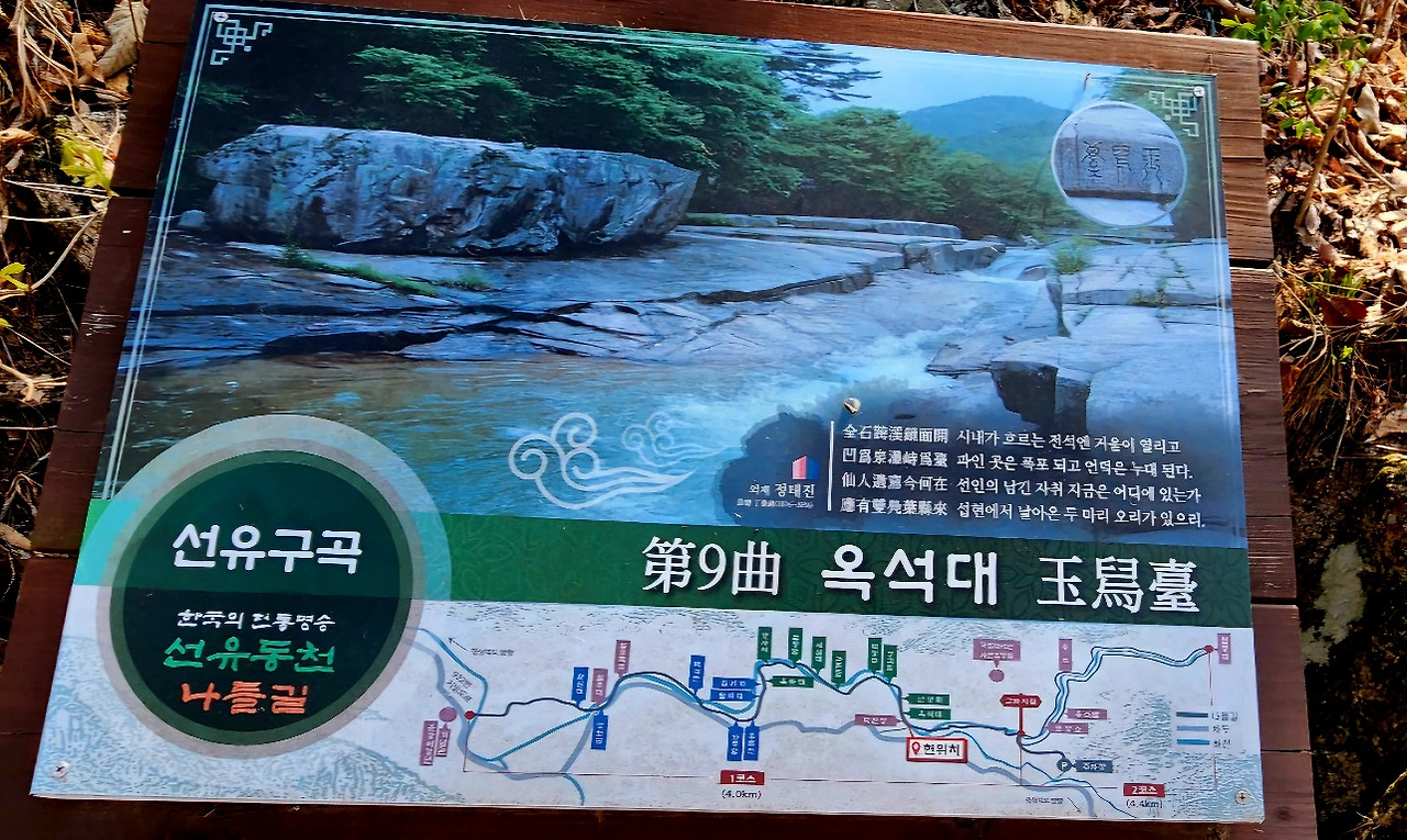 구곡은 장소마다 바위에 이름이 새겨져 있었다. 하지만 오랜 세월이 지나 어떤 것들은 잘 보이지 않았다. 길을 걷다 보면 스치고 지나기 쉬웠지만 길목마다 설명이 되어 있는 게시판이 있어 좋은 안내자가 되었다.
