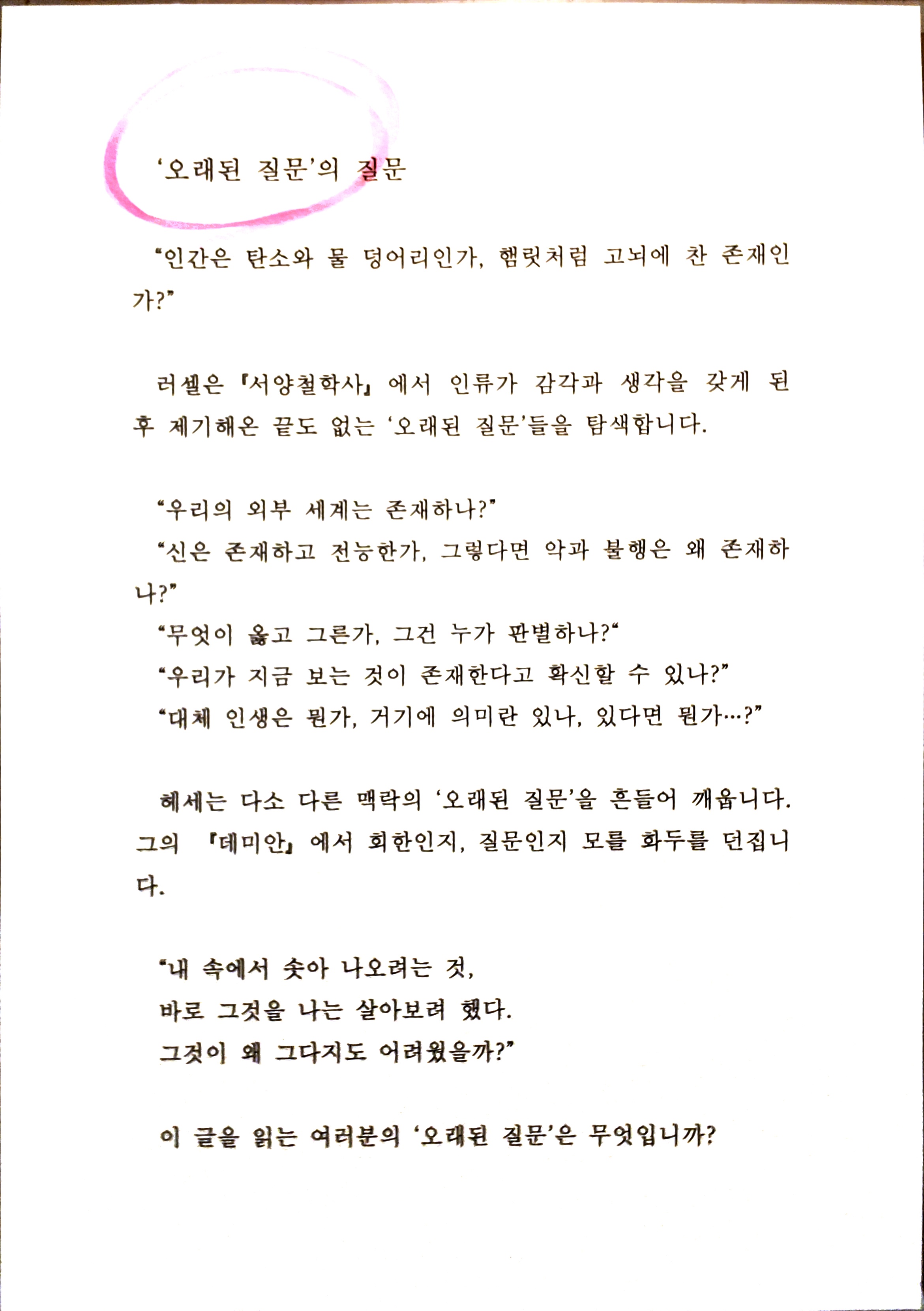 서점 입구에 ‘오래된 질문의 질문’이라는 글을 써 붙였다. ‘오래된 질문’ 버전의 ‘질문을 권함’인 셈이다. 서점 이름이 왜 ‘오래된 질문’이냐고 묻는 분들이 적지 않은 데다 그들이 스스로 질문을 찾아내길 독려하는 마음에서다.