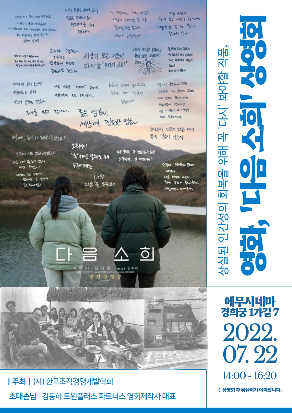 리더십은 영향력이다. 영향력은 사람들에게 끼치는 것이 아니라 사람들이 느끼는 것이다. 권위는. 자신이 세우는 게 아니라 타인들이 세워주는 것처럼. 지금 할 수 있는 작은 몸짓이 누군가에게 공명을 일으킨다. 공교롭게도 영화 번개일에 맞춘 강의 요청이 들어왔다. '직장 내 괴롭힘과 인권'을 주제로 한 내용을 원한다고. 학회 도반들이 영화를 보고 있는 동안, 나는 강의를 통해서 <다음 소희>를 들려주련다. 팔짱을 푸는 일이 어떻게 빗장까지 열게 하는지. 알게 되었다는 책임을 어떻게 표현할 수 있는지.